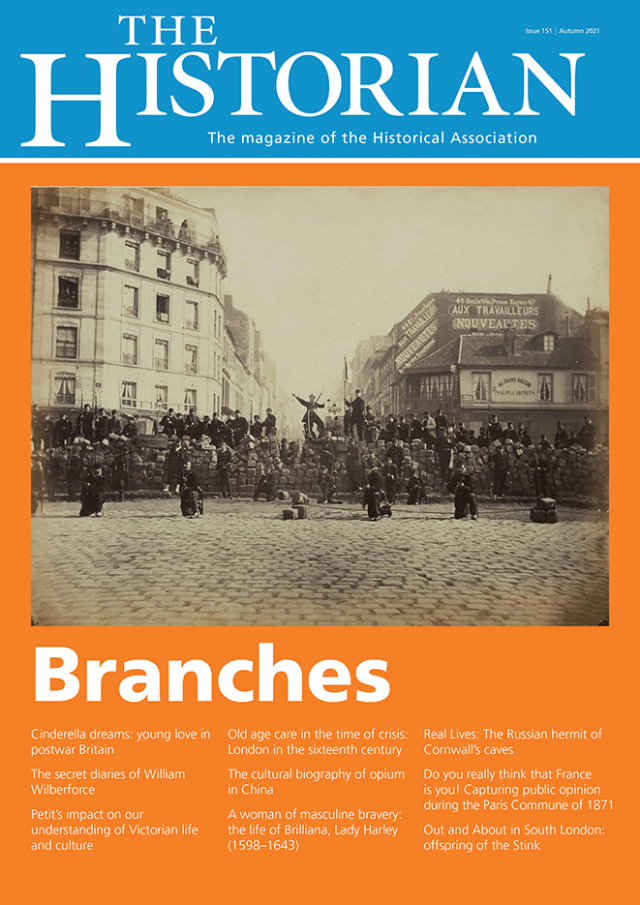 We open with articles based on two branch lectures. Carol Dyhouse gave her lecture on changing attitudes to marriage after the Second World War to the Cambridge Branch, highlighting the way in which popular culture contributed to teenage girls’ expectations and resulted in a drop in women’s average age at marriage. John Coffey’s talk on William Wilberforce’s diaries revealed to the Isle of Wight Branch just what can be learned by going back to the original documents rather than relying on the highly-selective edition published by his sons in 1838, five years after his death. Two more articles have links to our branch membership. Zheng Yangwen is a regular speaker to branches, and her fascinating article challenges familiar narratives about opium by reminding us that it was, at its heart, a consumer culture, however uncomfortable this might be to hear. Meanwhile, Christina Fox’s lecture on looking after the elderly poor in sixteenth-century London was one of the most popular contributions to the General Strand of the online HA Conference this year. Other articles widen our scope, but are again indicative of the wide range of activities you might find at your local branch. Sara Read’s article on Brilliana, Lady Harley, gives us an insight into how this young woman found fulfilment in family, education and standing up for her beliefs, while in the year of its 150th anniversary, Jason Jacques Willems explores the difficulties facing those who want to study popular opinion during the Paris Commune.